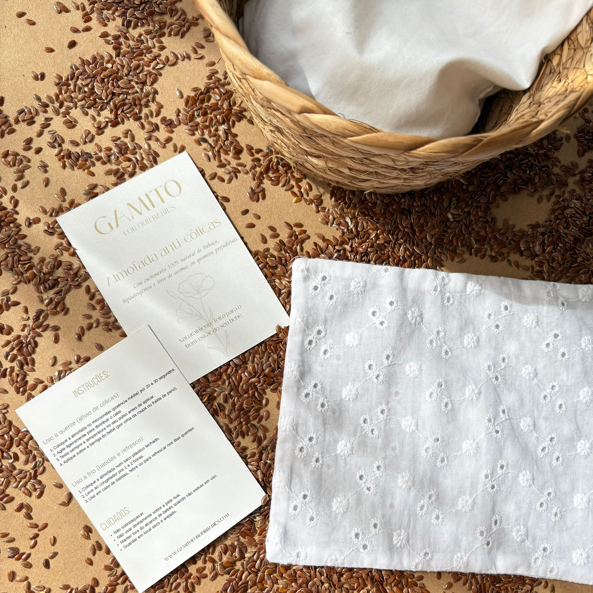 O enchimento de linhaça é 100% natural e livre de libertar aromas ou substâncias prejudiciais, garantindo total segurança para o bebé.